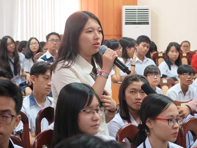 Một học sinh bày tỏ ý kiến với lãnh đạo Sở GD&ĐT TP tại buổi đối thoại. Ảnh: PA