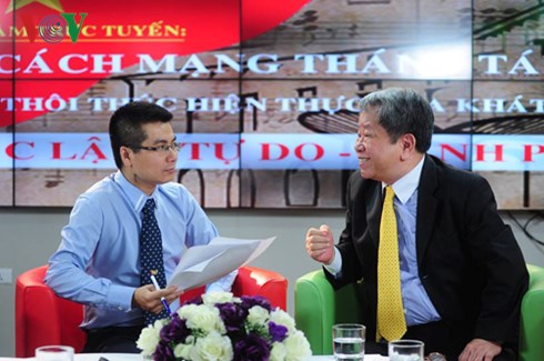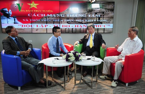 Chiều 28/8, tại Hà Nội, Báo điện tử VOV (VOV.VN) đã tổ chức cuộc tọa đàm với chủ đề "Cách mạng Tháng Tám và thôi thúc hiện thực hóa khát vọng "Độc lập - Tự do - Hạnh phúc". Ba vị khách mời tham gia chương trình là: PGS.TS Phạm Xanh (Khoa Lịch sử - Đại học Khoa học xã hội và Nhân văn, ĐHQG Hà Nội); ông Nguyễn Trần Bạt, Chủ tịch, Tổng Giám đốc Công ty Invest Consult Group (chuyên về tư vấn đầu tư và kinh doanh) và ông Nguyễn Quang Khai, nguyên Đại sứ Việt Nam tại một số nước thuộc Trung Đông.