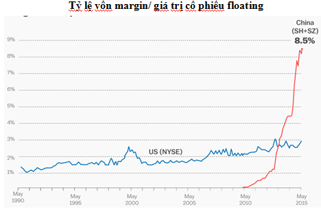 • Tỷ lệ đòn bẩy tài chính (vay margin) ở mức cao.Tỷ lệ vốn margin/ giá trị số cổ phiếu floating thị trường Trung Quốc đạt gần 9%, cao gấp 5 lần so với mức trung bình ở hầu hết các thị trường phát triển. Điều này đồng nghĩa với khi tâm lý đảo chiều, giá cổ phiếu sẽ sụt giảm rất nhanh do áp lực giải chấp margin rất lớn của thị trường.