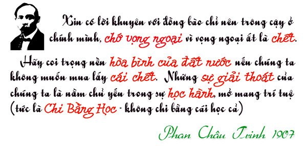 Tuyên ngôn vĩ đại CHI BẰNG HỌC cho tương lai tốt đẹp của dân tộc Việt Nam đã được Phan Châu Trinh phát biểu rõ ràng năm 1907. Tới năm 1933, Huỳnh Thúc Kháng đăng lại tư tưởng đó thành danh ngôn như sau: “Vậy xin cùng nói lời chính cáo cùng người nước ta rằng: “Không bạo động, bạo động tất chết! Không trông người nước ngoài, trông người nước ngoài tất ngu! Đồng bào ta, người nước ta, ai mà ham mến tự do, tôi xin có một vật rất quý báu tặng cho đồng bào, làCHI BẰNG HỌC“.